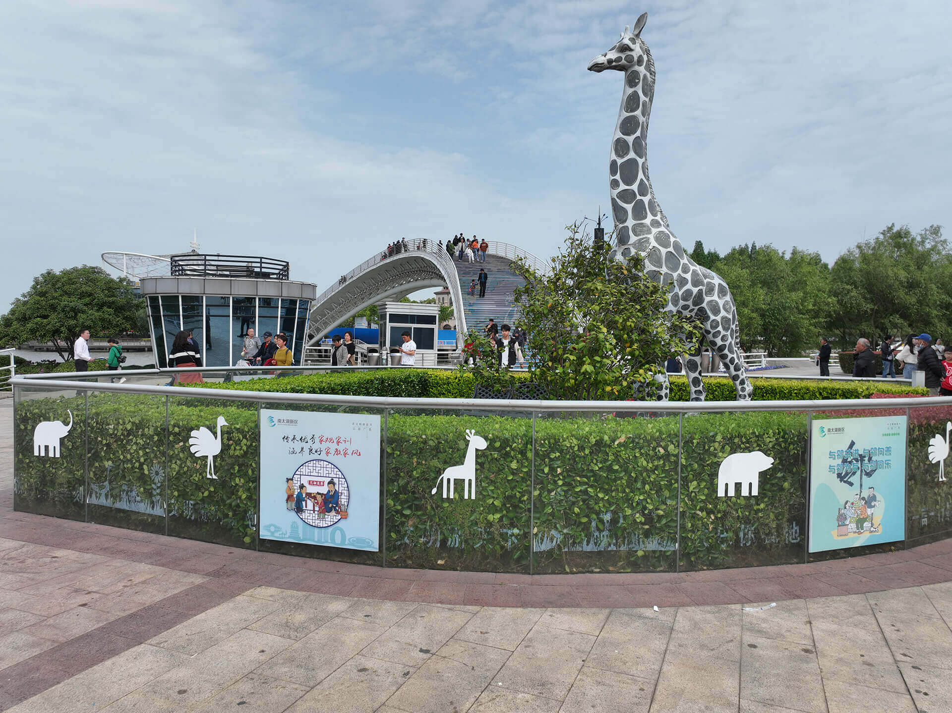 月亮廣場(chǎng)與漁人碼頭由我們的“網(wǎng)紅”月亮橋相連接,當(dāng)夜幕降臨時(shí),橋面上那一對(duì)開屏的孔雀駕著七彩祥云,如仙女般翩翩起舞,成了八方游客來南太湖必到的地方。